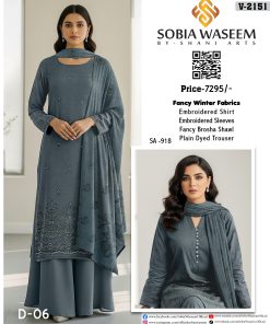 The embroidered shirt features delicate motifs that add subtle glamour and depth to the outfit. Intricate detailing on the embroidered sleeves enhances its charm, showcasing Sobia Waseem’s signature artistry and attention to precision. The embroidery across the border gives the outfit a regal finish, perfect for both casual and formal winter occasions.