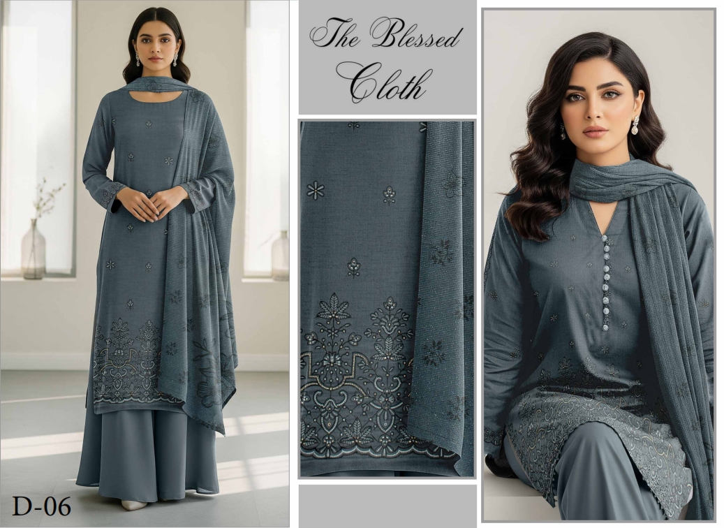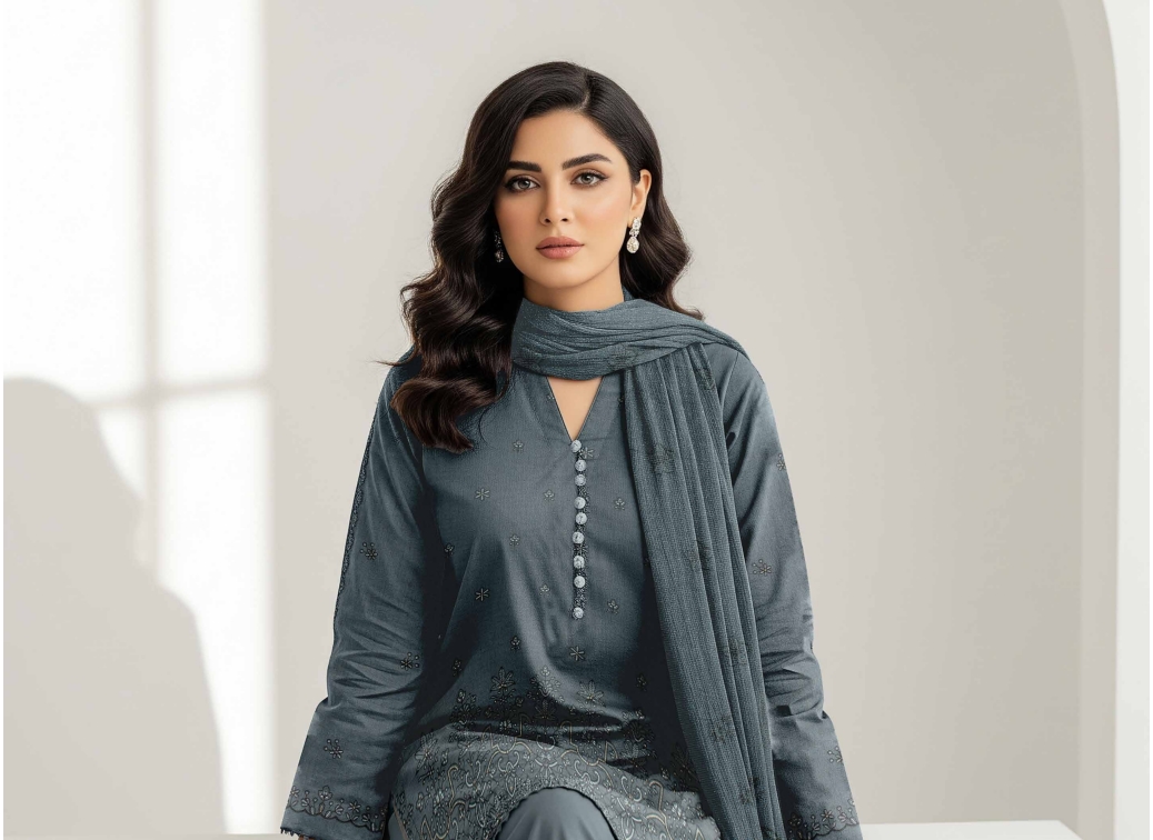 Redefine sophistication this season with this 3-piece unstitched winter suit from Sobia Waseem by Shani Arts. The graceful steel grey color exudes poise, calm, and refined elegance, making it an ideal choice for women who love understated luxury. Crafted from fancy winter fabric, this ensemble beautifully combines warmth, comfort, and timeless style.